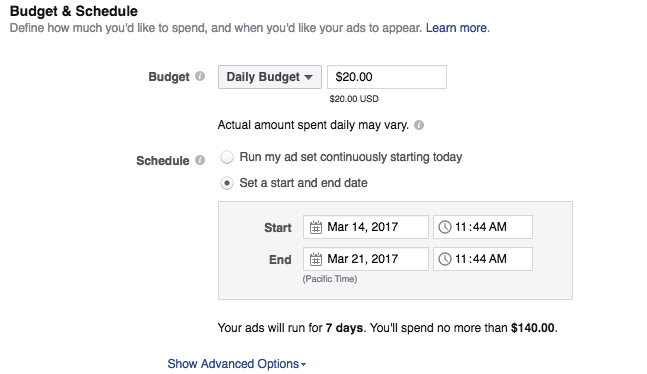 This section allows you to choose what type of budget. The two you can choose from are between a daily budget (budget for each day) or a lifetime budget (budget for the whole duration of your advertising).