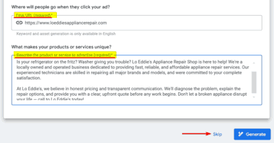 While Google AI can generate ad copy terms based on your website’s content, you have the option to create your own. If you prefer to write your own ad copy, feel free to skip this feature.