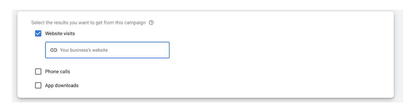 Create a campaign without a goal’s guidance and then select “Search Campaign”. Following this, there will be a bullet list of three options. Select “Website visits” and then fill in the website that you want to focus on.