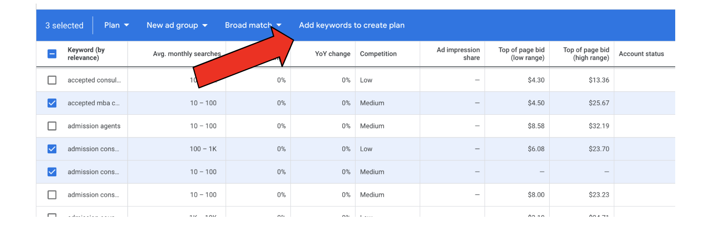 By going into “Tools and Settings” and then selecting “Keyword Planner” then search up a keyword that you want to focus on. An example of this could be “College Admissions Consultants”