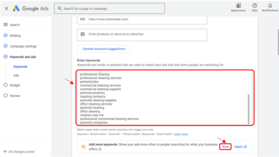 A list of suggested keywords will be shown inside the box. Click View if you would like to add more keywords suggested by Google Ads, then click Apply