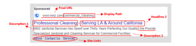 Ads: You create specific ads for each Ad Group. These ads should be customized to the keywords and theme of the Ad Group. So, in the Ad Group for janitorial services, your ads should focus on promoting your janitorial services.