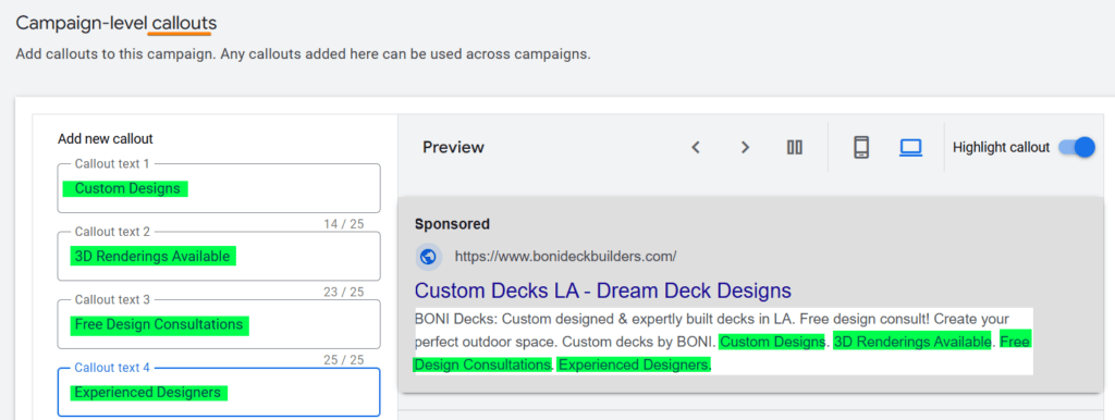 Callouts in Google Ads are short, non-clickable phrases that highlight unique selling points or benefits of your business. They appear beneath your ad’s description and provide additional information to persuade potential customers.