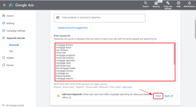 Google is able to scan keywords from the provided competitors website or products and services. A list of keywords will appear inside the box. Click View to show other keyword suggestions.