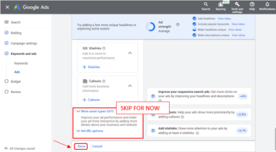 Moving on to Keywords and Ads, this is where you will create ad groups based on related keywords. This helps you organize your ads and tailor them to specific search queries.