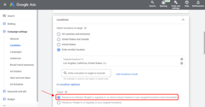 Under Locations, you may geographically target your ads to reach the right audience by choosing your location and areas you service.