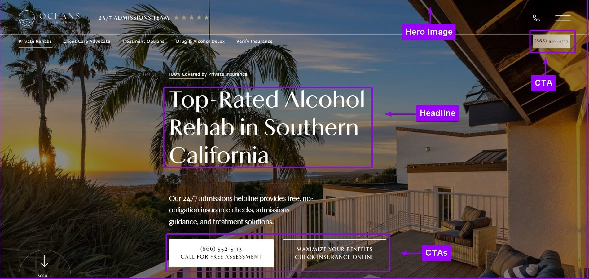 The user sees a massive, clickable phone number to “Call Our 24/7 Admissions Line” (high commitment, low volume, but highest value).