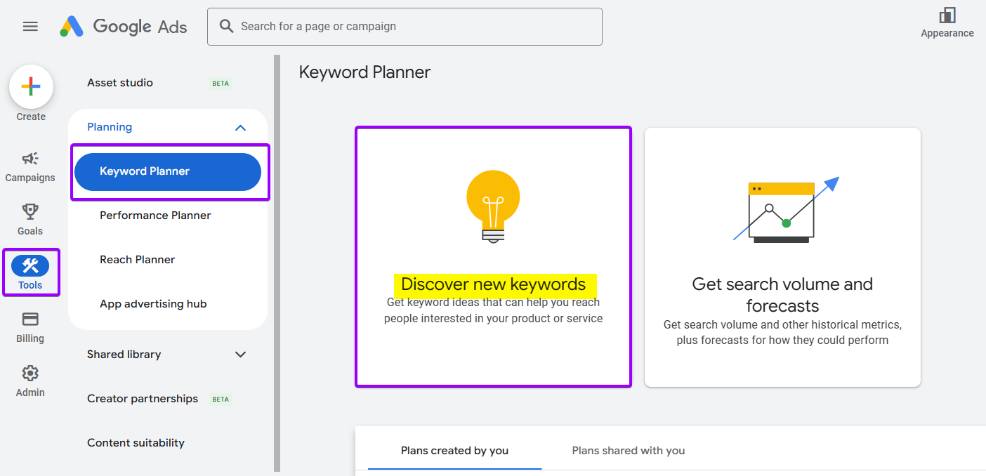 A free tool within the Google Ads interface that provides search volume data (how many people search for a term) and cost estimates (suggested bids) for specific keywords.