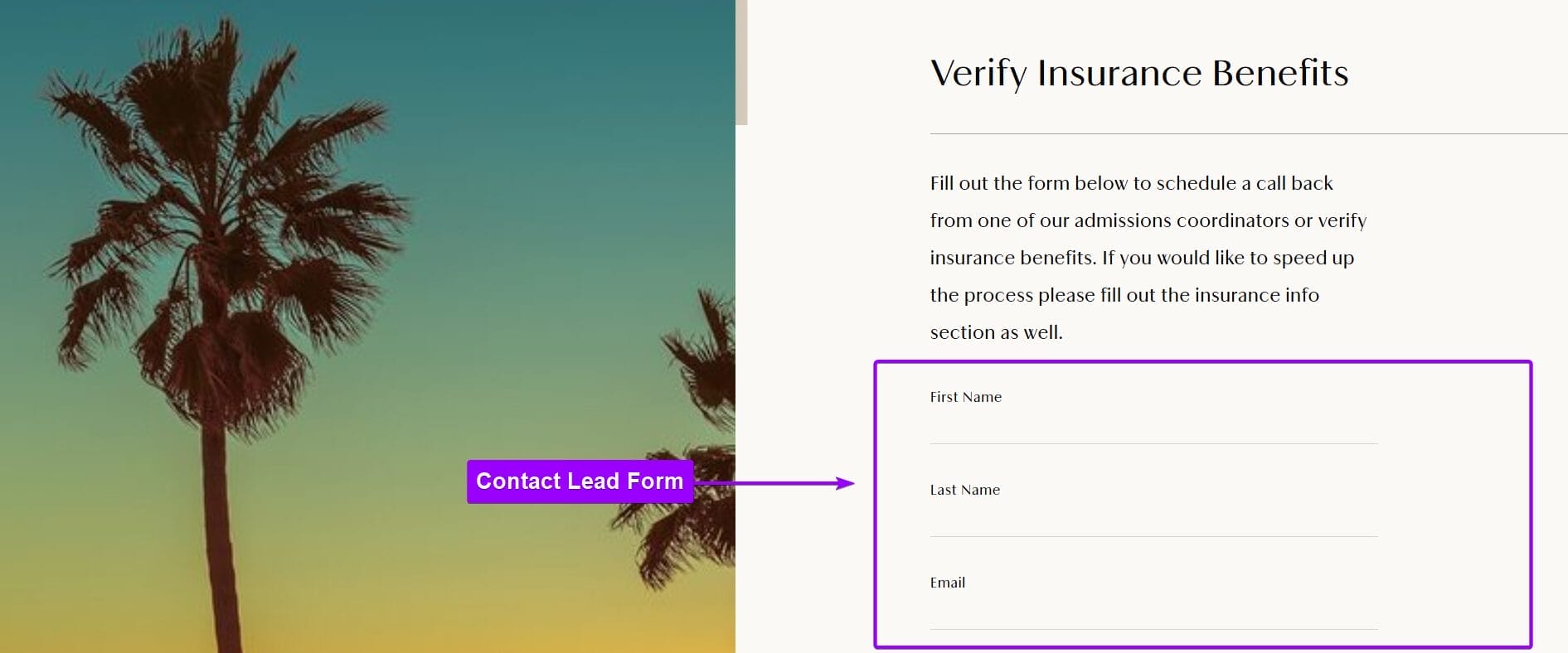 The user submits a form to “Verify Insurance Instantly” (low commitment, high volume).