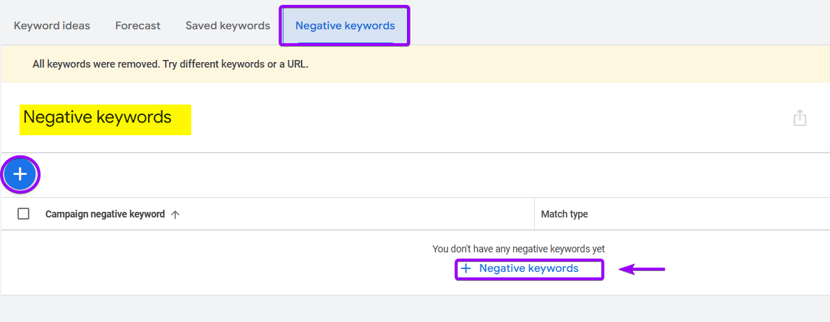 Specific words or phrases that you add to your campaign or Ad Group to prevent your ad from showing when those terms are included in a user’s search query.