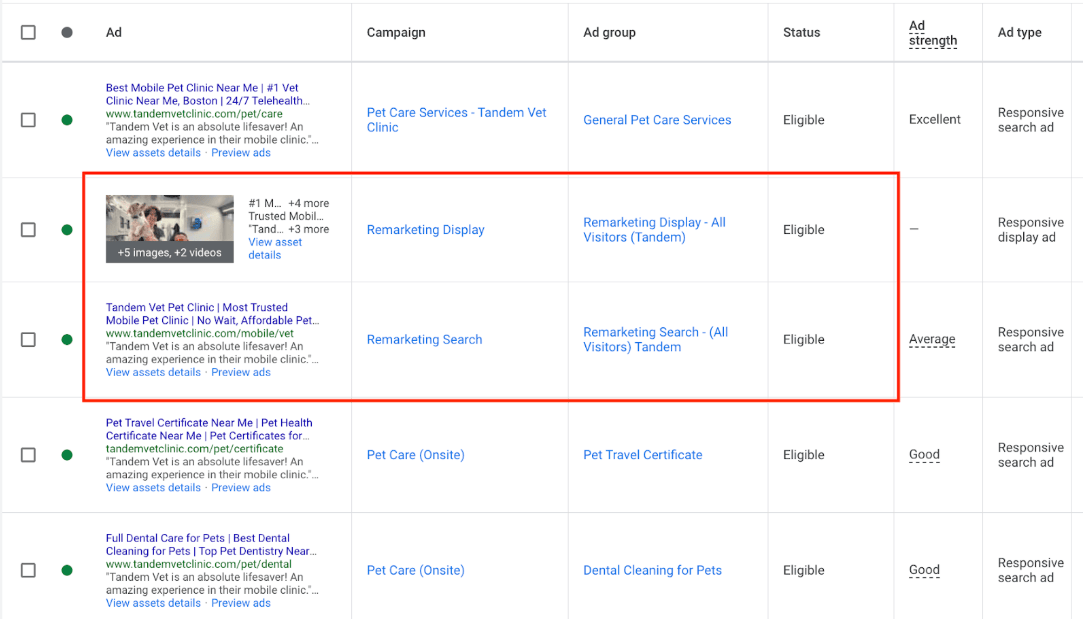 The new campaign (pet care services – tandem vet clinic) appears to be performing well so far and is already generating leads. We have decided to pause the “vet services” campaign and allocate the entire budget to the new campaign.