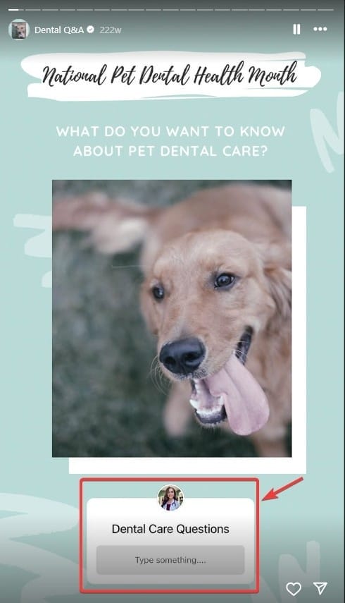 - “Ask the Vet” Q&A: Promote a day where your vets answer general pet care questions submitted by your followers via Stories or comments. Compile the answers into a Reel series.