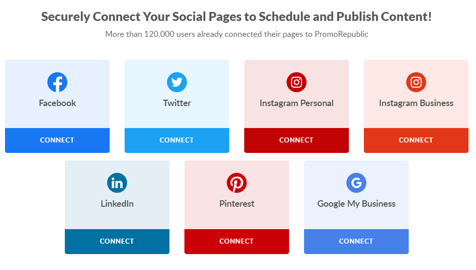 All the connected accounts are listed and you still connect more social media channels that you haven’t connected yet to PromoRepublic.