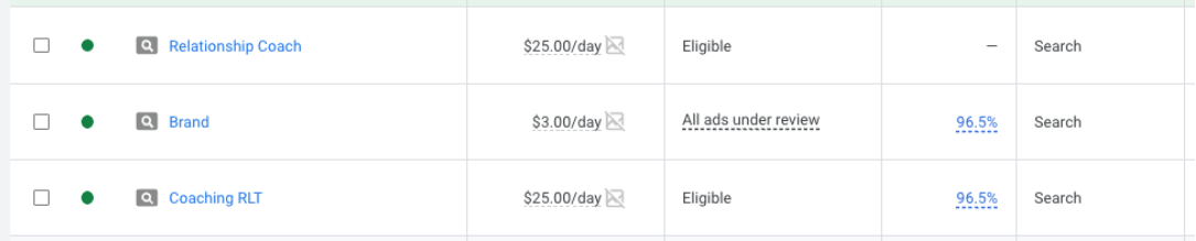 We started Google Search campaigns for Brand, Coaching RLT, and Relationship Coach.