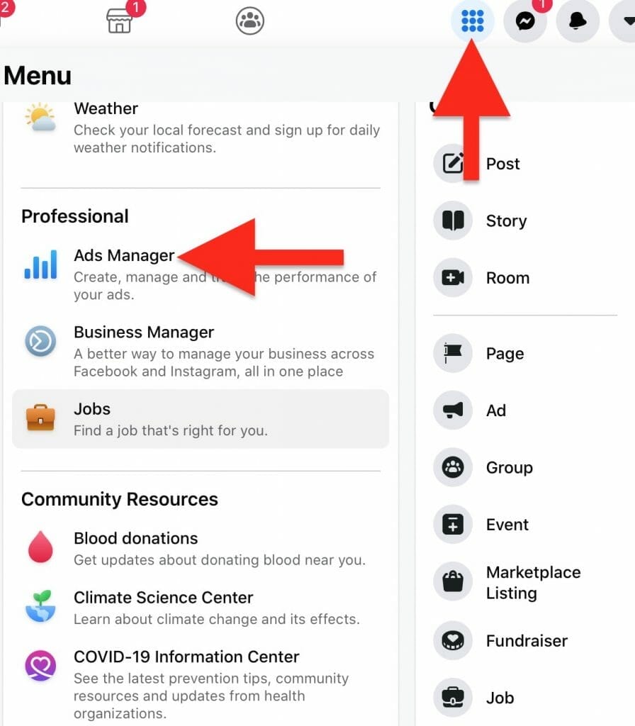To create and install a Pixel ID, go to your menu and click on the Ads Manager tab.