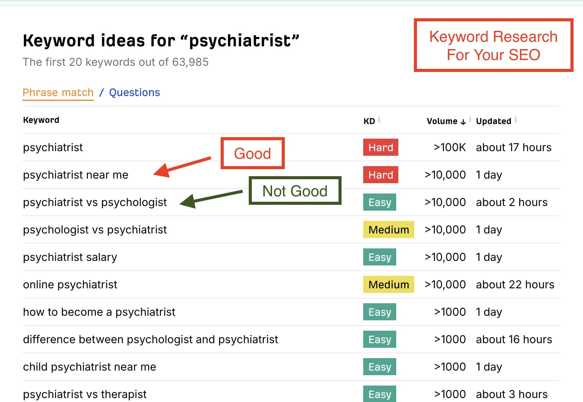 Understanding keyword difficulty helps you focus your energy on realistic targets instead of wasting time chasing words that are almost impossible to rank for. By mixing in both lower-difficulty, specific keywords and some higher-difficulty ones, psychiatrists can build a balanced SEO strategy that brings traffic now while slowly working toward more competitive terms over time.
