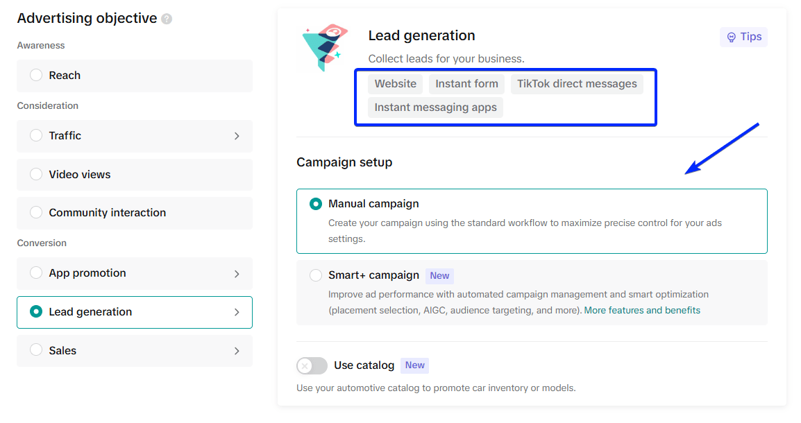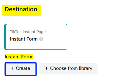For a Lead Generation campaign, your optimization location will be Instant Form. This is the most efficient way to capture a lead’s contact information, as it keeps them on the TikTok platform and reduces friction.